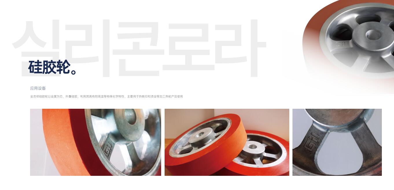 金吉祥硅膠輪以金屬鋁為芯,外覆硅膠。利用其耐高溫等化學特性,廣泛應用于轉印熱貼等領域。